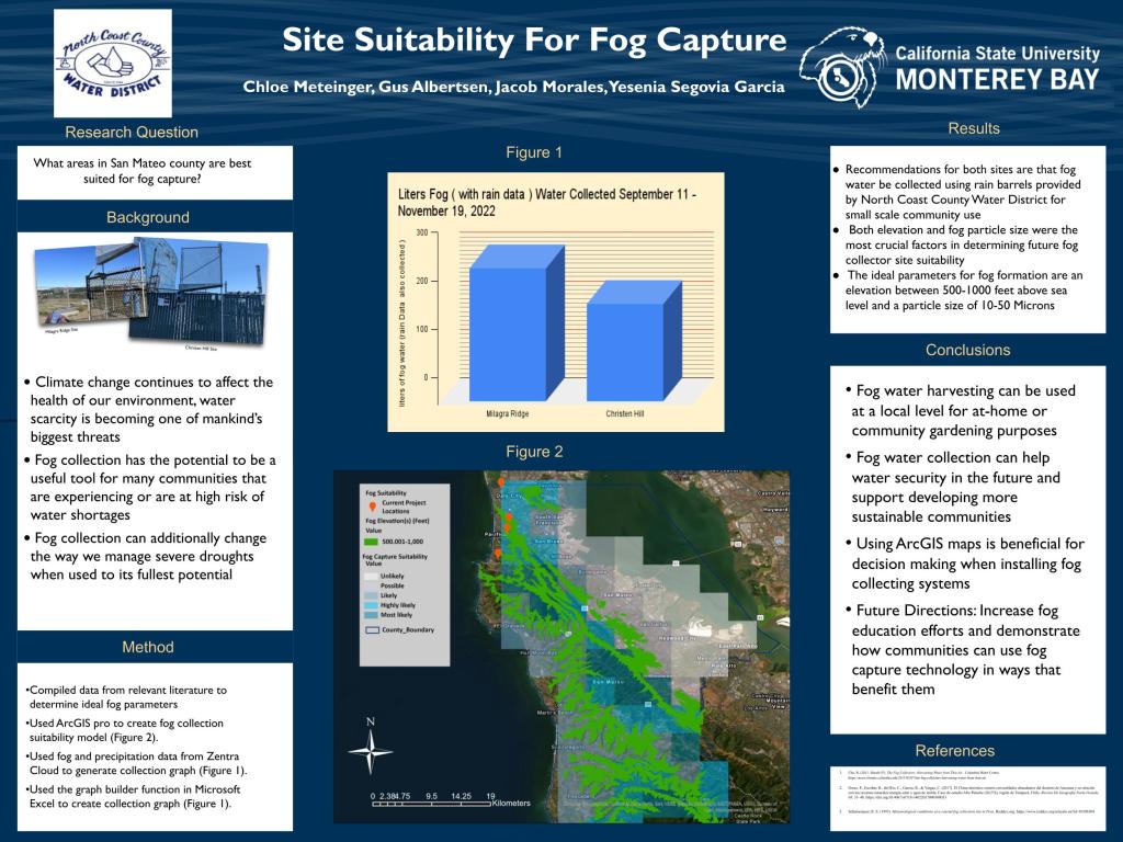 For my capstone, or senior project, I had an opportunity to collaborate with three people in my class. The entire class focused on fog water collection in two cities in San Mateo County: Pacifica, and Daly City, to help these two cities manage data from fog collectors that they had recently installed. Our class worked with these two municipalities with fog data collection as well as making recommendations for fog water use once the fog water has been collected. My group examined whether fog water could be used to irrigate home and community gardens.